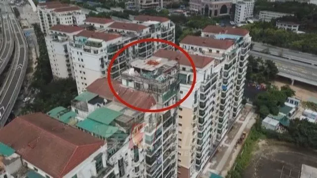 視頻中記錄的空中“碉堡”位于福田天澤花園里的一棟居民樓頂層,小高層共12層,加建的樓房遠(yuǎn)高于樓房常規(guī)屋頂!