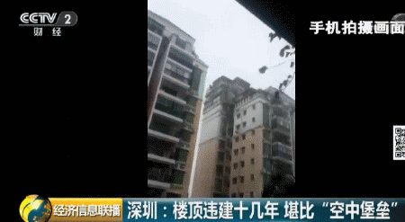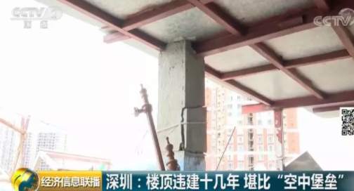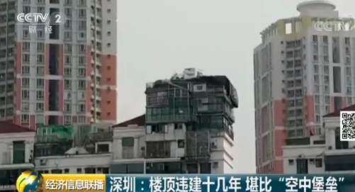 深圳福田區(qū)一個小區(qū)的居民日前爆料稱,小區(qū)一位業(yè)主違規(guī)在天臺上加建了幾層樓,遠遠看去就像一個“空中堡壘”,曾經有人差點被上面掉落的鋼筋砸中,如此醒目的違建,已經存在了十幾年。
