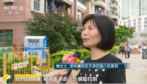 深圳福田區(qū)天澤花園小區(qū)居民常女士:我自己本人曾經就在這下邊,被掉下來的一個鋼筋嚇到,當時離這個鋼筋掉下來的位置就只有兩米遠。