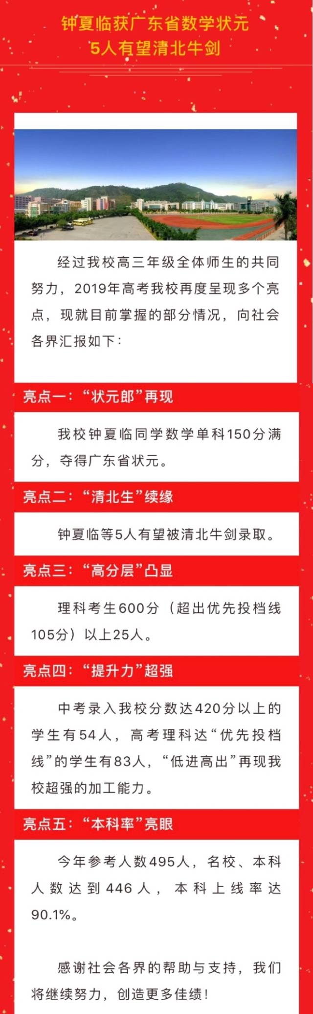 學(xué)校稱(chēng)其2019年高?!案叻謱印蓖癸@,理科考生600分(超出優(yōu)先投檔線105分)以上25人;“本科率”亮眼,今年參考人數(shù)495人,名校、本科人數(shù)達(dá)到446人,本科上線率達(dá)90.1%;此外,還提到“提升力”,稱(chēng)中考錄入該校分?jǐn)?shù)達(dá)420分以上的學(xué)生有54人,高考理科達(dá)“優(yōu)先投檔線”的學(xué)生有83人,實(shí)現(xiàn)“低進(jìn)高出”。