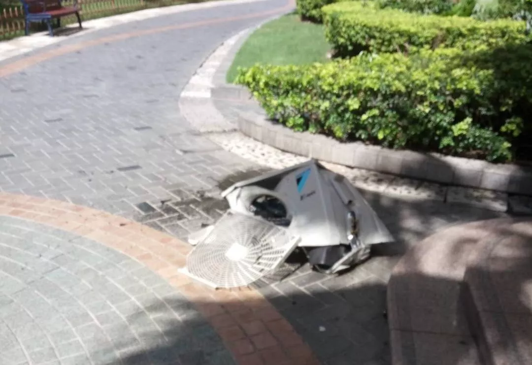 ▲高空掉落砸壞變形的空調(diào)外機(jī)