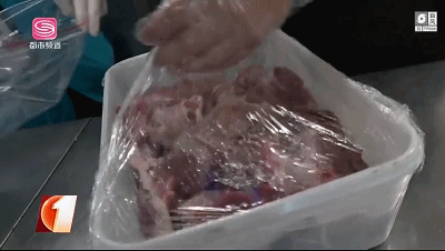 △執(zhí)法人員和檢測人員來到該餐廳后廚隨機挑選肉品進行檢測