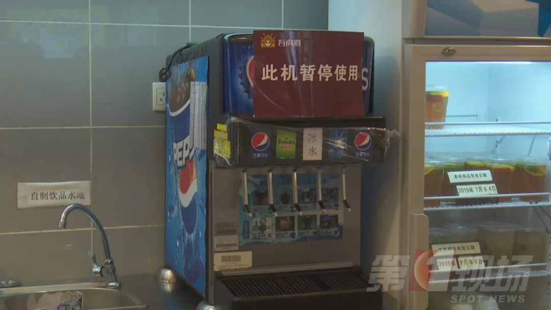 今天中午,記者跟隨轄區(qū)市監(jiān)所執(zhí)法人員來(lái)到涉事門(mén)店現(xiàn)場(chǎng)檢查。據(jù)了解,2號(hào)事發(fā)后,店里的這臺(tái)飲料機(jī)已經(jīng)暫停使用,目前飲料出口是用保鮮膜封住的。店方稱,飲料機(jī),每個(gè)月由百事可樂(lè)廠家人員深層清洗一次,他們的員工是每天對(duì)飲料機(jī)的糖漿管道和濾嘴進(jìn)行清洗,都有清洗記錄。
