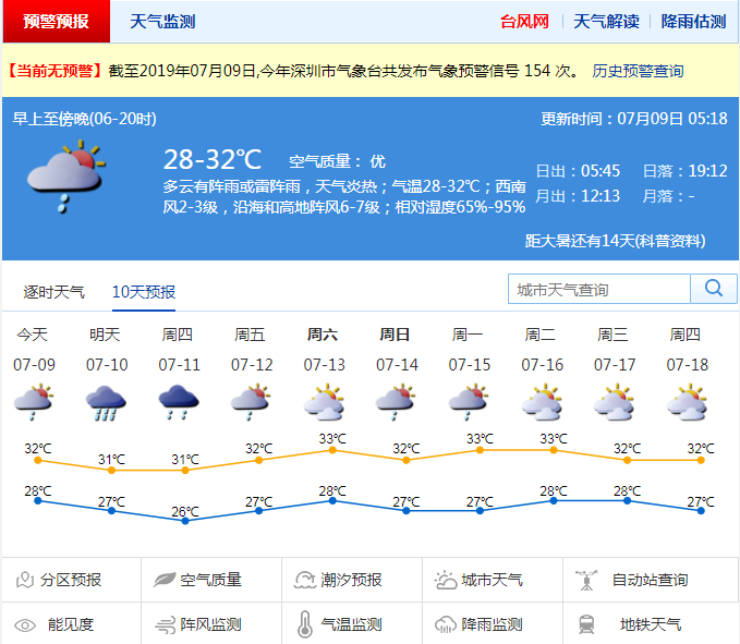深圳新聞網(wǎng)2019年7月9日訊 近幾天,深圳天氣炎熱,有短時陣雨,白天最高氣溫達到31~33 ℃。預(yù)計9日有陣雨或雷陣雨,10~11日將有一次中到大雨局部暴雨過程,伴有雷暴和7~8級短時大風(fēng),炎熱天氣將有所緩解。