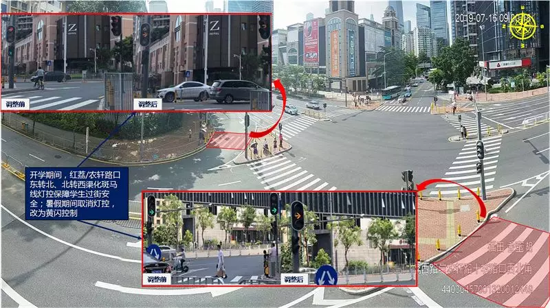 福田紅荔/農(nóng)軒路口暑假期間行人過(guò)街流量減少,取消東轉(zhuǎn)北、北轉(zhuǎn)西兩處渠化燈控,改為黃閃控制。