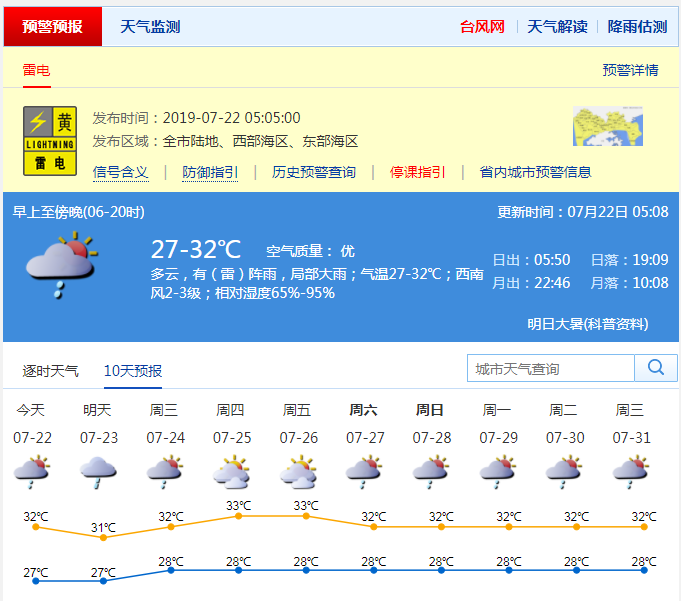 深圳新聞網(wǎng)2019年7月22日訊 炎熱與局地陣雨是近日深圳天氣的主題。據(jù)市氣象局預(yù)計(jì),未來兩天我市依然陽光陣雨相伴,部分時(shí)間雨勢較大。其中,22日多云,有(雷)陣雨,局部大雨;27-32℃;西南風(fēng)2-3級(jí);濕度65%-95%。預(yù)計(jì)23-24日有(雷)陣雨,局部大雨;25-26日天氣炎熱,有局地短時(shí)陣雨。