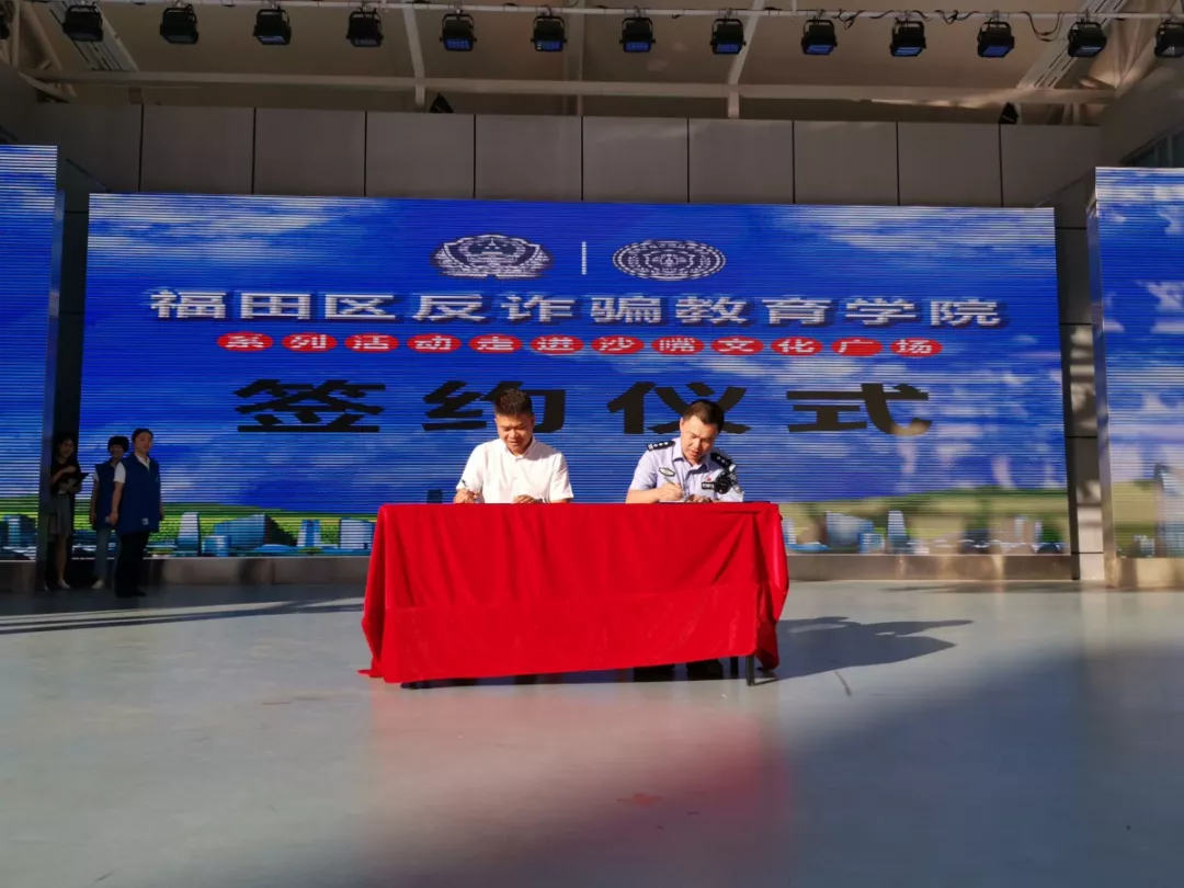 活動現(xiàn)場,肖劍平所長與沙頭街道辦黨工委副書記熊新清及沙嘴實(shí)業(yè)股份有限公司簽署了《福田反詐騙教育??窇?zhàn)略合作協(xié)議。