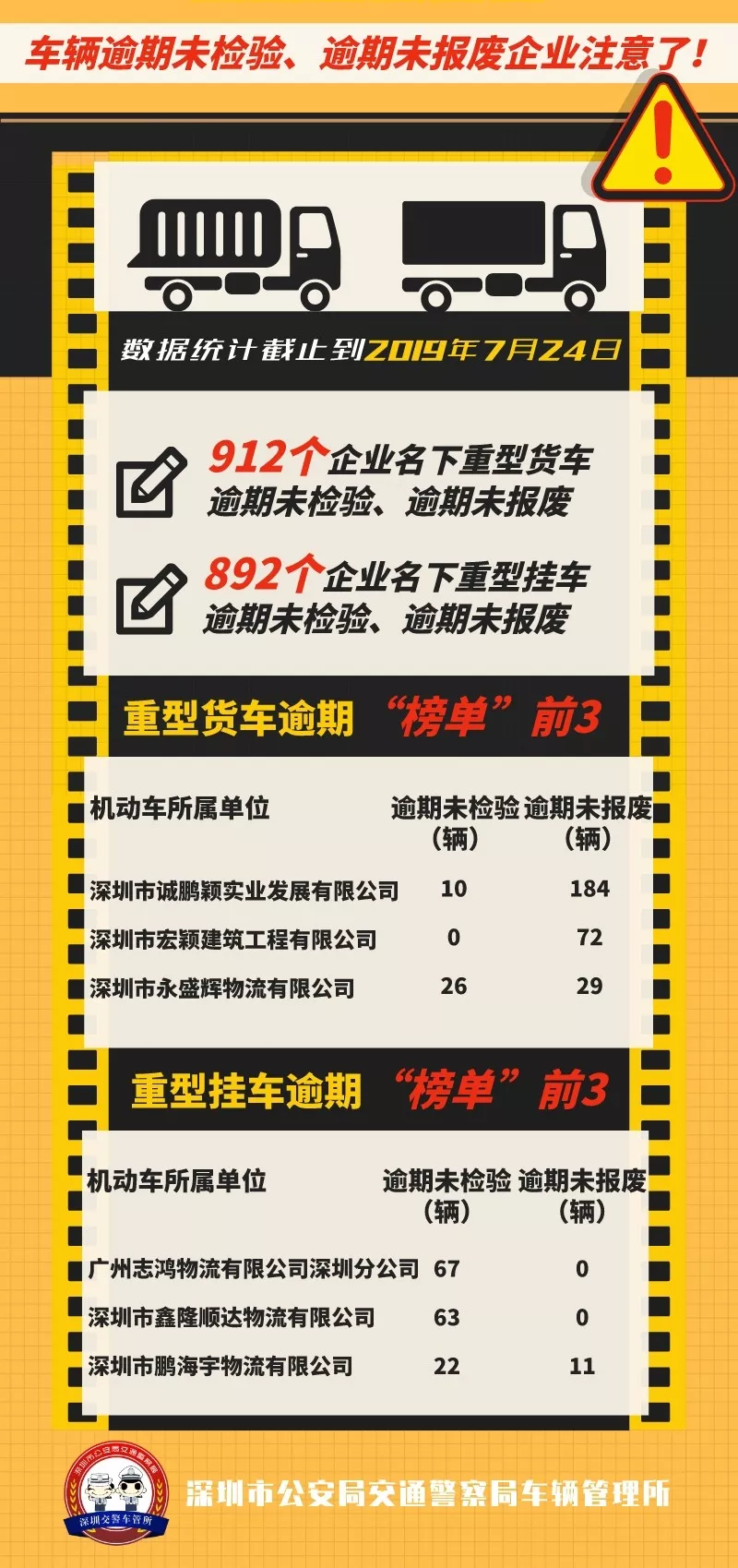 見圳客戶端·深圳新聞網(wǎng)2019年7月26日訊(見圳客戶端 深圳新聞網(wǎng)記者 何暢)車輛逾期未檢驗、逾期未報廢,存在著重大交通安全隱患,深圳部分企業(yè)不重視安全管理、名下有大量“問題車輛”未處理。7月26日“深圳交警權(quán)威發(fā)布”微信公眾號就對相關(guān)企業(yè)進(jìn)行了點名曝光。