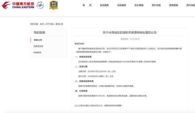 繼深航之后,東航也剛剛發(fā)布了關于臺灣地區(qū)航線相關客票特殊處置的公告:涉及購買東航臺灣地區(qū)航線客票(東航實際承運及*MU代碼共享的781客票)的自由行旅客,出票日期在2019年7月31日24:00(含)之前,旅行日期在2019年8月1日零時(含)之后的,旅客可在客票有效期內,申請辦理退票手續(xù),無須支付退票手續(xù)費。