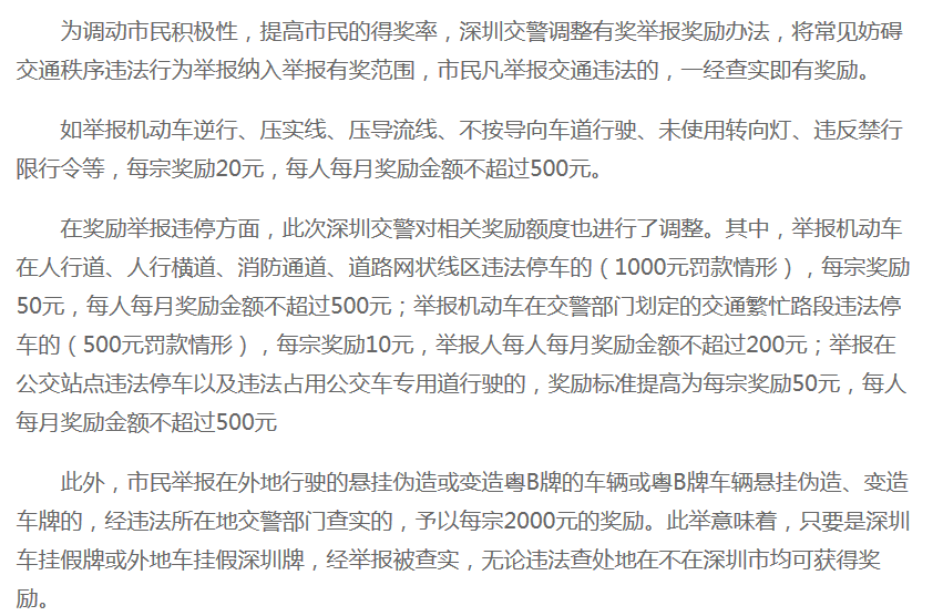 交警蜀黍會(huì)視情況給你獎(jiǎng)金的!因?yàn)樽?月29日起,深圳所有交通違法都可有獎(jiǎng)舉報(bào)啦