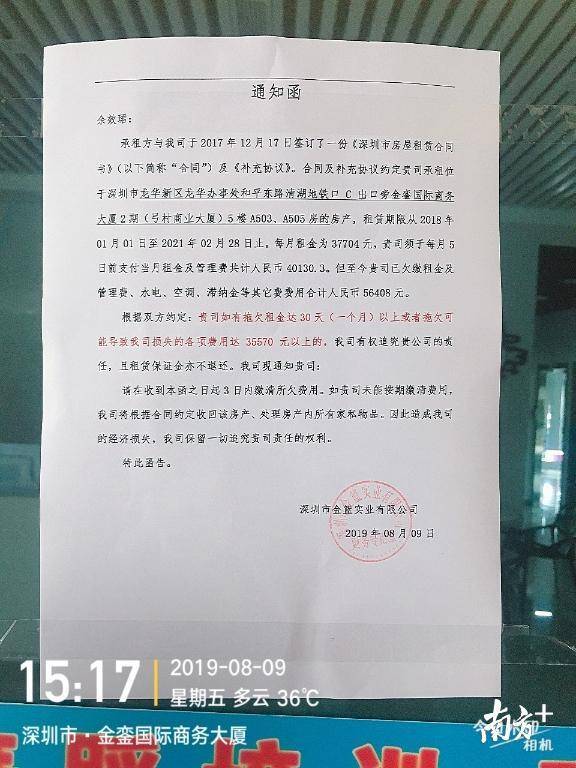 事實上,攸攸舞蹈學校清湖校區(qū)因“不定期停電影響正常上課”的情況自今年5月30日已出現(xiàn),當時即有學員猜測是校方拖欠租金所致。而8月9日,舞蹈室門外出現(xiàn)了一份落款為深圳市金籃實業(yè)有限公司的通知函,上面顯示該校區(qū)已欠繳租金、管理費、水電等費用總計56408元。足見欠費已持續(xù)一段時間。