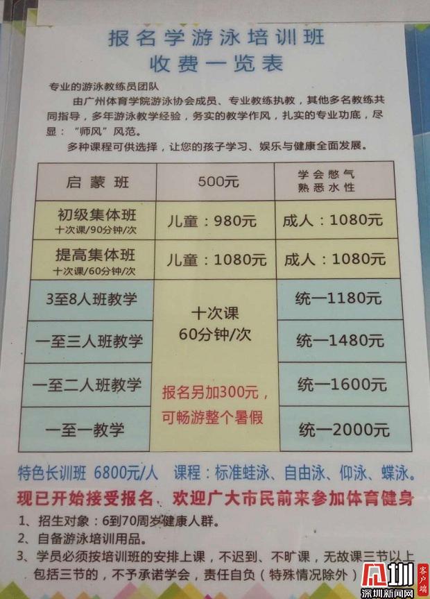 某社會機構的游泳培訓班價格