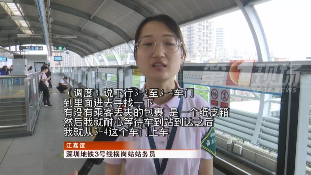 當(dāng)時(shí),一輛列車即將到達(dá)龍崗的橫崗站,站務(wù)員從3-4號(hào)門(mén)上車尋找。最終,站務(wù)員在列車座位下面找到了乘客遺失的紙箱,