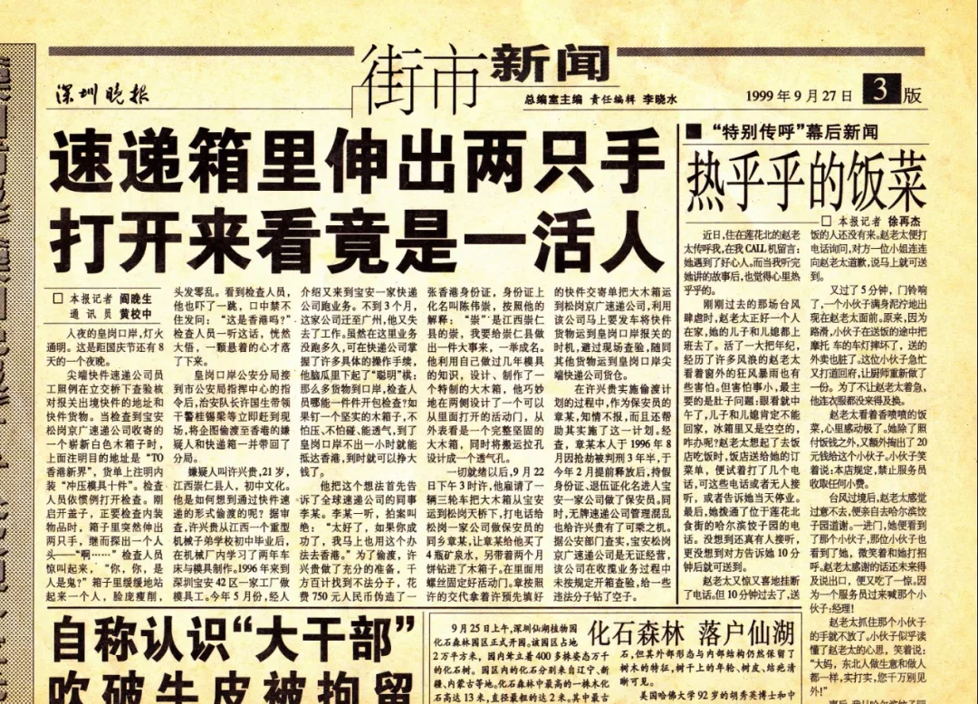 而歷史賦予這支鐵軍的特殊使命任務(wù)則是重拳打擊口岸走私和偷渡犯罪。皇崗口岸派出所老職工桂錫梁至今還珍藏著一份些許泛黃的舊報(bào)紙,一篇名為“速遞箱里伸出兩只手,打開來看竟是一活人”的報(bào)道記錄了1999年9月22日曾發(fā)生的一起偷渡案件。作為當(dāng)時參與處置的一員,桂錫梁回憶道,犯罪分子將自己裝進(jìn)一個特制的大木箱中,偽裝成裝有“沖壓模具”發(fā)往香港的快遞箱,計(jì)劃偷渡出境,最終在位于皇崗口岸附近的快遞轉(zhuǎn)運(yùn)點(diǎn)被警方查獲。