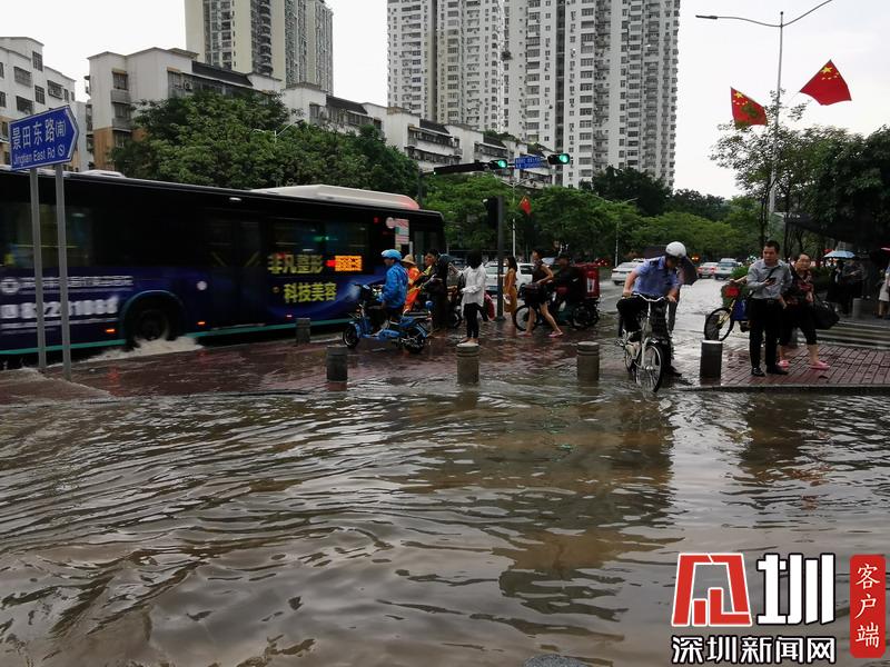 蓮花路景新花園公交站附近,車輛和行人涉水。