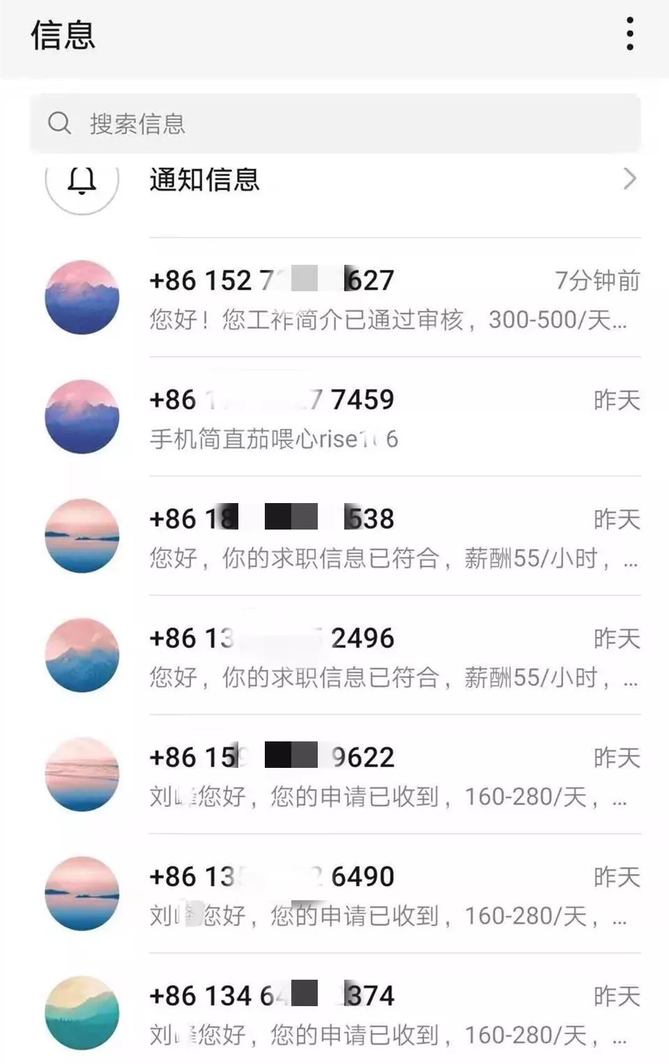 各種招聘電話以幾分鐘一個(gè)的頻率不斷打進(jìn)來(lái)。其中不少號(hào)碼一再被提示為高風(fēng)險(xiǎn)號(hào)碼。