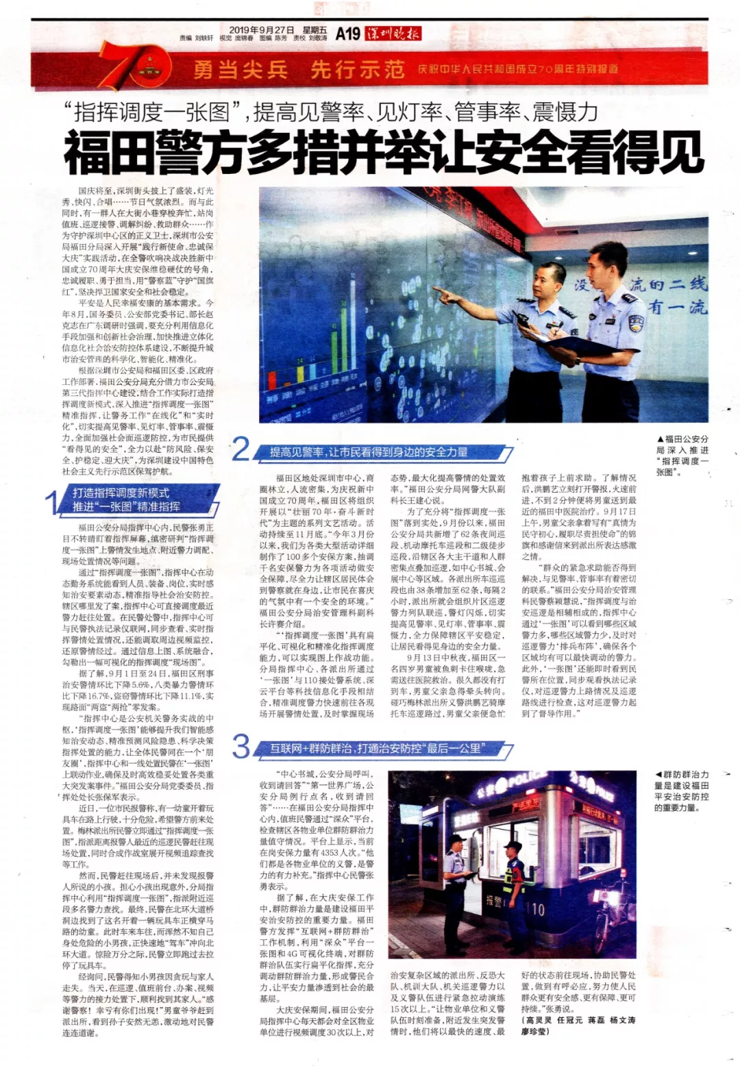 國(guó)慶將至,深圳街頭披上了盛裝,燈光秀、快閃、合唱……處處喜氣洋洋,節(jié)日氣氛濃烈。在這鮮艷亮麗的平安底色下,有一群人在大街小巷穿梭奔忙,站崗值班、巡邏接警、調(diào)解糾紛、救助群眾……作為守護(hù)深圳中心區(qū)的正義衛(wèi)士,深圳市公安局福田分局深入開(kāi)展“踐行新使命、忠誠(chéng)保大慶”實(shí)踐活動(dòng),在全警吹響決戰(zhàn)決勝新中國(guó)成立70周年大慶安保維穩(wěn)硬仗的號(hào)角,忠誠(chéng)履職、勇于擔(dān)當(dāng),用“警察藍(lán)”守護(hù)“國(guó)旗紅”,努力營(yíng)造平安祥和歡樂(lè)的節(jié)日氛圍,堅(jiān)決捍衛(wèi)國(guó)家安全和社會(huì)穩(wěn)定。