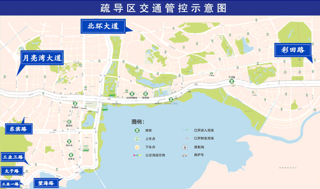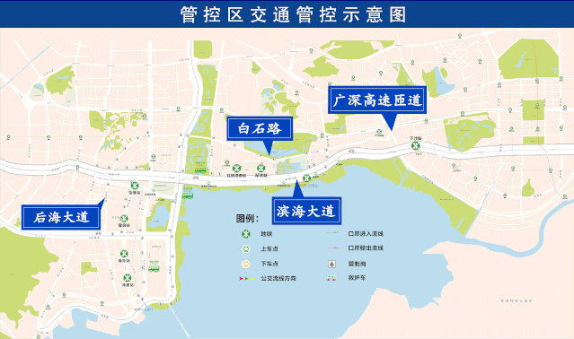 以深圳灣人才公園為中心,濱海大道(南海立交至竹子林立交段雙方向)、沙河西路(濱海大道至東濱立交雙方向)、望海路(東濱立交至中心段雙方向)、中心路(科苑南路至望海路雙方向)、科苑南路(東濱路至中心路段東側(cè))、東濱路(后海濱路至科苑南路段,不含)、后海濱路(濱海大道至東濱路,不含)的合圍區(qū)域?qū)嵤┙煌ü苤?;以及濱海大道東往西方向(竹子林立交至南海立交),西往東方向(南海立交至竹子林立交)實(shí)施交通管制。