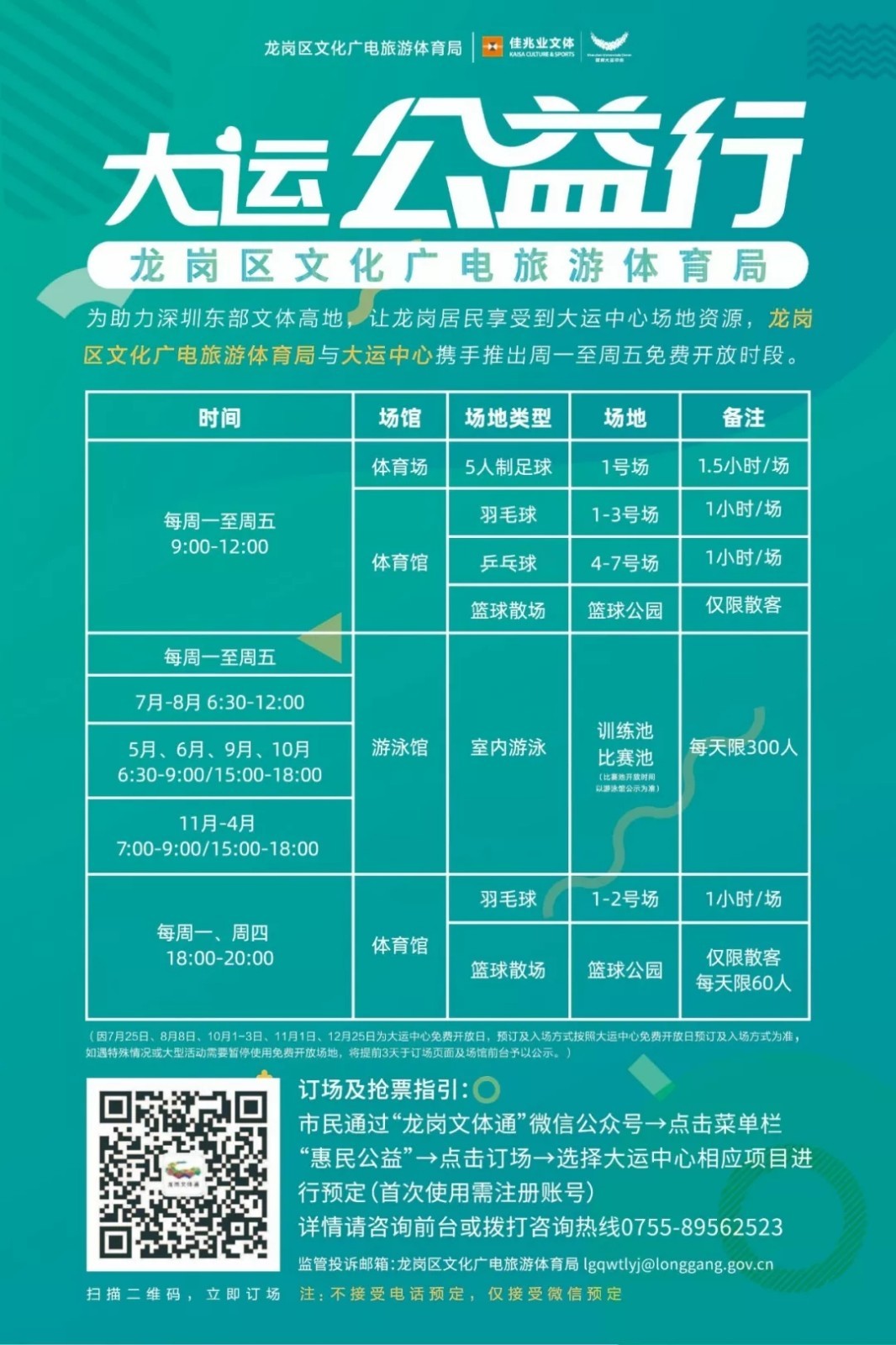 此外,龍崗區(qū)文化廣電旅游體育局與大運(yùn)中心攜手推出的文體惠民開放項(xiàng)目周一至周五每天免費(fèi)開放半天持續(xù)進(jìn)行中,具體時間及搶票攻略如下: