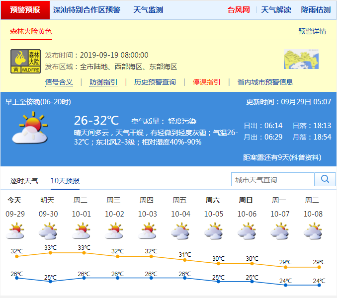 見圳客戶端·深圳新聞網(wǎng)2019年9月29日訊 今天9月29日深圳晴天間多云,天氣干燥,有輕微到輕度灰霾,氣溫26-32℃;東北風2-3級;相對濕度40%-90%。森林火險預(yù)警生效中,請繼續(xù)做好防火安全宣傳和管理工作。