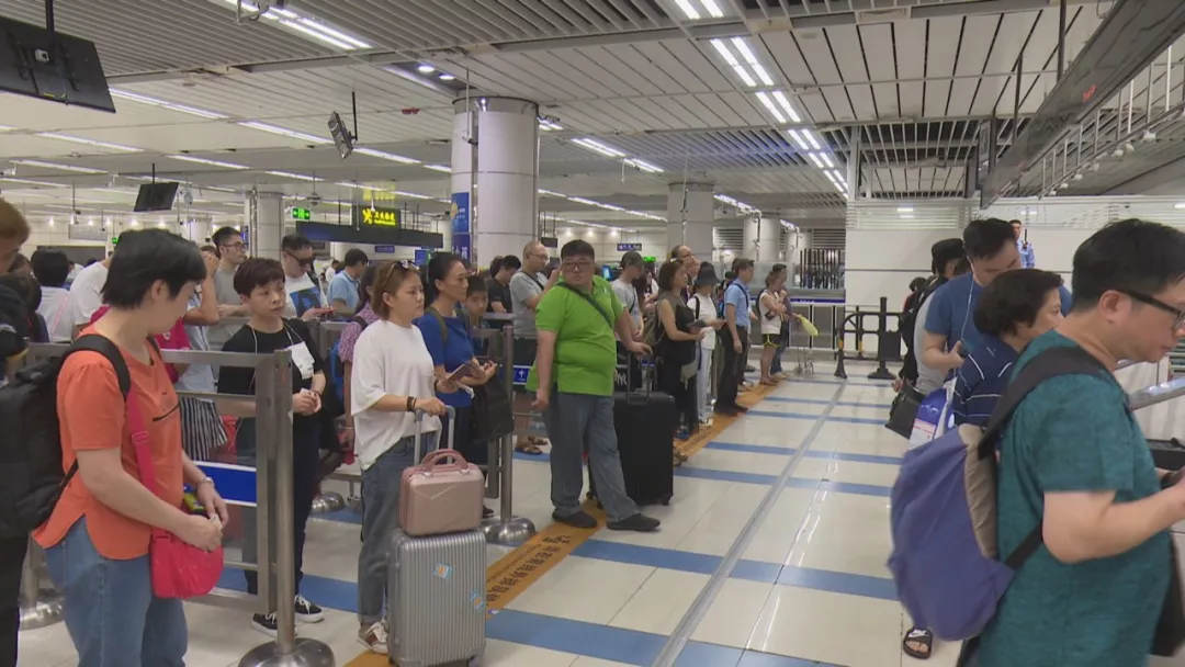 10月5日中午12點(diǎn),在皇崗口岸的入境大廳,有不少旅客提著大包小包的行李準(zhǔn)備排隊(duì)過(guò)關(guān)。整個(gè)入境大廳15條自助通道和13條人工通道已經(jīng)全部開(kāi)啟,排隊(duì)過(guò)關(guān)的市民都可以在3分鐘之內(nèi)快速通關(guān)。