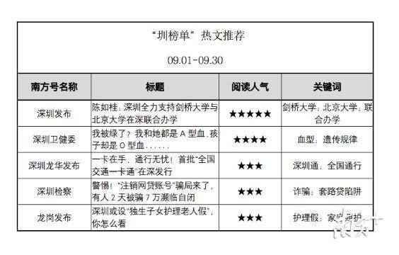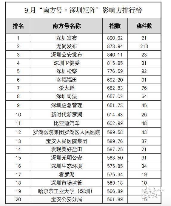 原標(biāo)題:5個南方號首上榜,“深圳發(fā)布”蟬聯(lián)第一!“南方號·深圳矩陣”9月榜單出爐