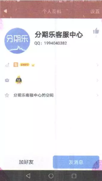 各種信息都對(duì)的上,陳林隨即添加了對(duì)方的QQ(昵稱:分期樂(lè)客服中心)。
