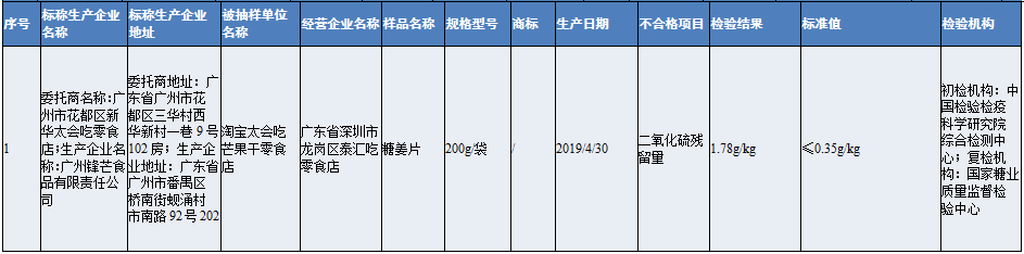 其中,深圳市龍崗區(qū)泰匯吃零食店經(jīng)營(yíng)的淘寶店銷售的糖姜片,被檢出二氧化硫殘留量不符合食品安全國(guó)家標(biāo)準(zhǔn)規(guī)定,存在食品添加劑超限量使用的問(wèn)題。