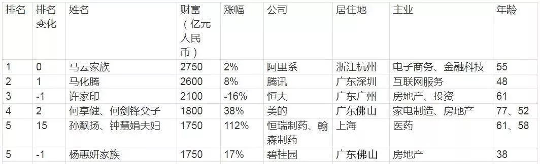 胡潤百富榜榜單前五
