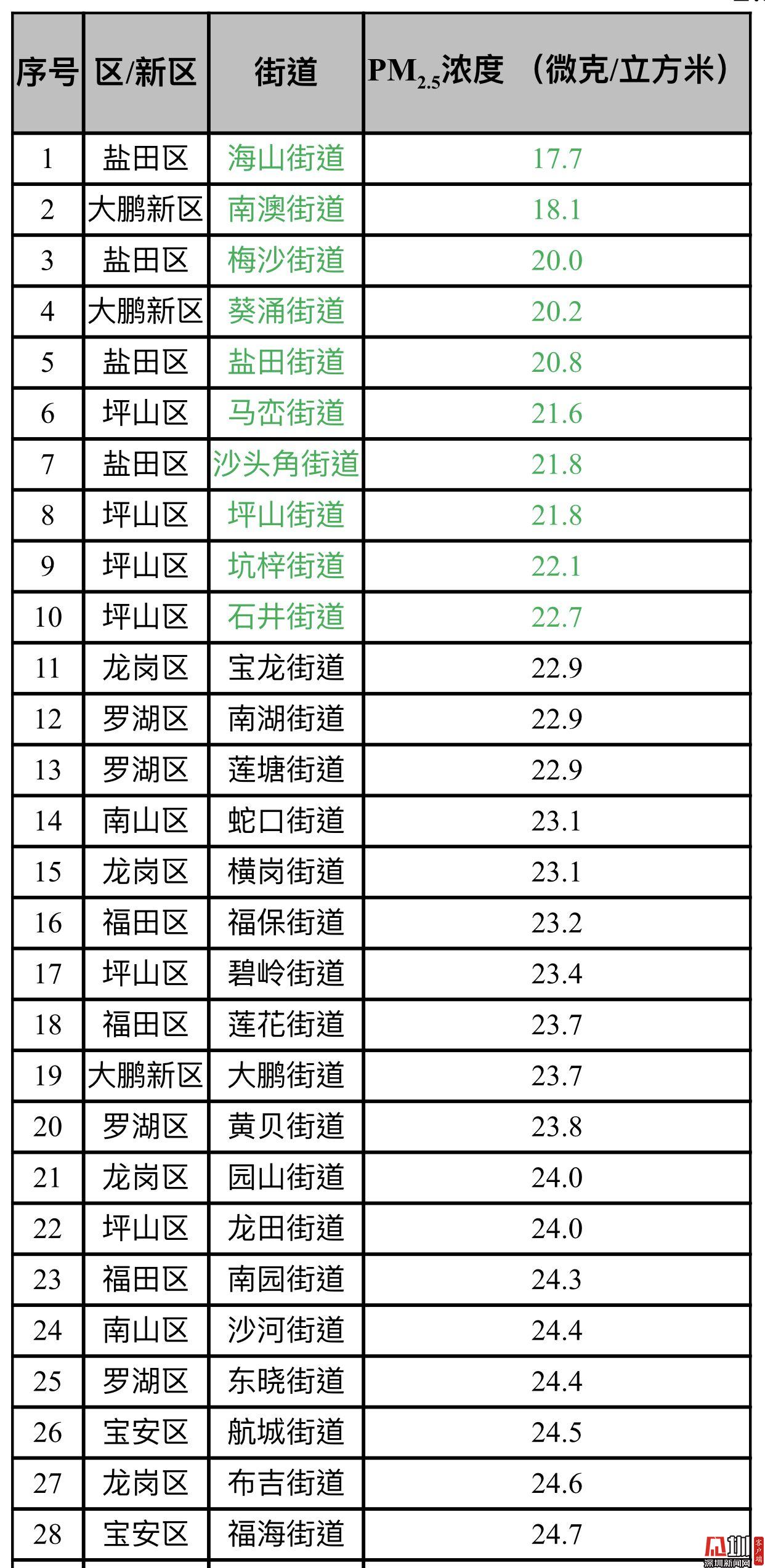 見圳客戶端·深圳新聞網(wǎng)2019年10月22日訊(見圳客戶端、深圳新聞網(wǎng)記者 陳婕)10月22日,記者從深圳市生態(tài)環(huán)境局了解到,2019年9月,全市74個(gè)街道PM2.5濃度在17.7-37.4微克/立方米之間,均值為26.1微克/立方米。排名前十的是海山、南澳、梅沙、葵涌、鹽田、馬巒、沙頭角、坪山、坑梓和石井等街道,排名倒數(shù)前十的為新湖、桃源、西鄉(xiāng)、福永、公明、大浪、馬田、觀瀾、福城和新安等街道。