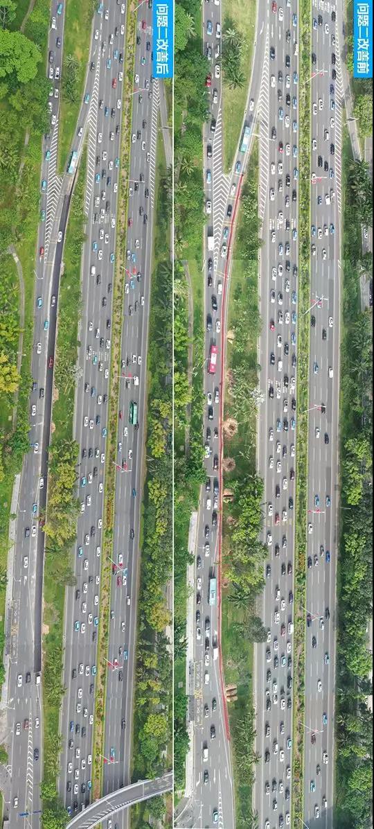 同時,造成沙河西右轉(zhuǎn)濱海大道處擁堵的,還有一個原因是主道車流與原輔道車流匯合后,局部交織沖突嚴重。為此,交警壓縮了輔道綠化隔離帶,將2車道擴寬為3車道!原輔道車流無需變道,即可順利通行。