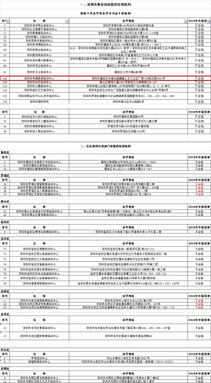 據悉,此次公告包括取得《中華人民共和國民辦學校辦學許可證》和《深圳市成人教育辦學機構注冊證》的教育培訓機構的辦學基本信息、2018年度年檢結果、新設立培訓機構及培訓機構分教點地址等基本信息。