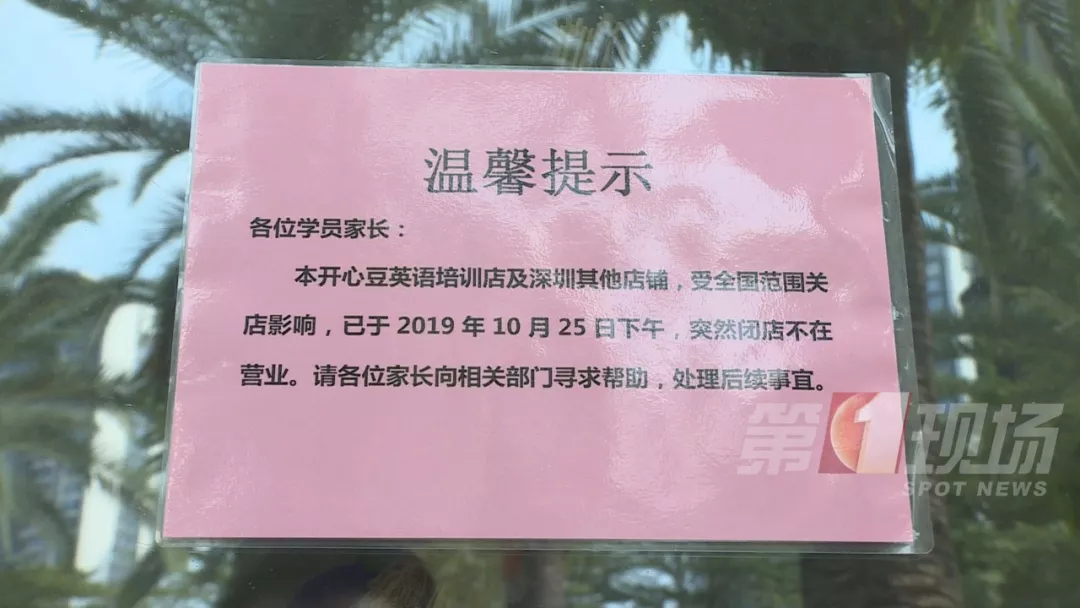 同時(shí),家住龍崗的多名家長(zhǎng),今天也聚集在、鳳凰城商業(yè)中心里的一家開(kāi)心豆少兒英語(yǔ)門前。這家店同樣是悄無(wú)聲息結(jié)業(yè)倒閉,人去樓空。商場(chǎng)管理方也貼出公告稱,這家店9月起就欠租,目前平湖長(zhǎng)廊警務(wù)室已成立專門工作組。