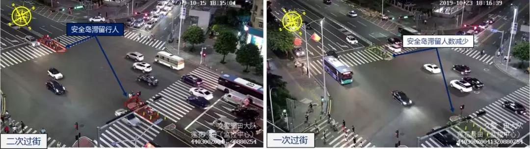 針對現(xiàn)狀問題,深圳交警采用單周雙次的信控策略,小批量、多頻次地放行嘉賓路方向車輛,緩解因公交車隊列化導致路口交通鎖死的問題;同時,采用行人專用相位集中放行行人,保障行人過街安全。路口優(yōu)化后,路口“回堵”現(xiàn)象顯著減少,行人過街安全性提高,路口高峰小時通過量從2130pcu/h增至2285pcu/h,上升7.28%。