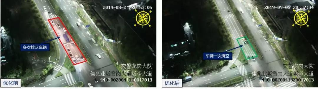 針對這一問題,深圳交警根據(jù)路口各時段、各方向的通勤需求,調(diào)整優(yōu)化了路口紅綠燈配時方案,適當增加了擁堵方向時間。優(yōu)化后,路口晚高峰西往東方向車輛排隊由300多米降至60米左右,下降80%,車輛基本實現(xiàn)1次通行。