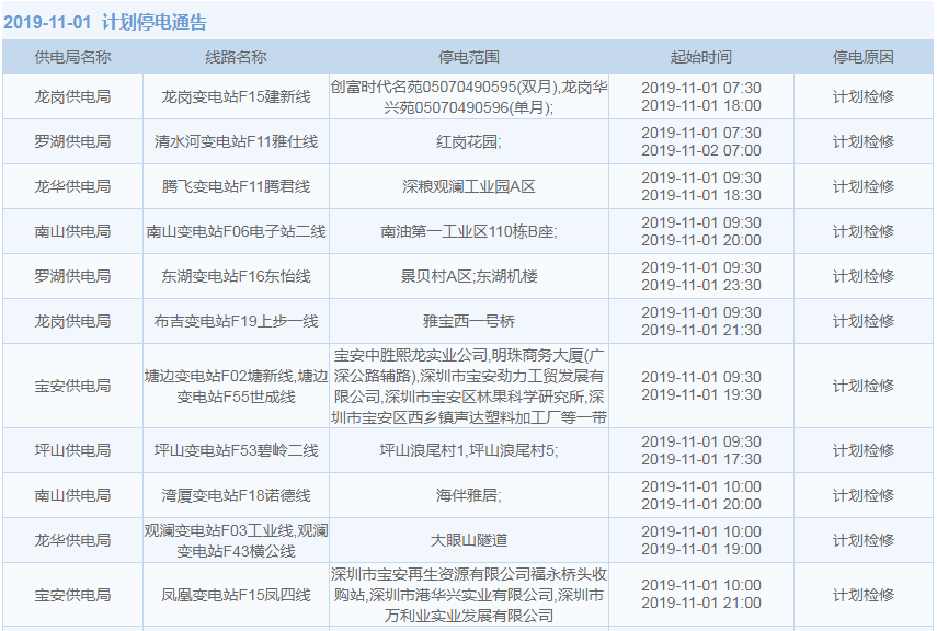 11月1日-15日,深圳這些地方將停電(附全名單)