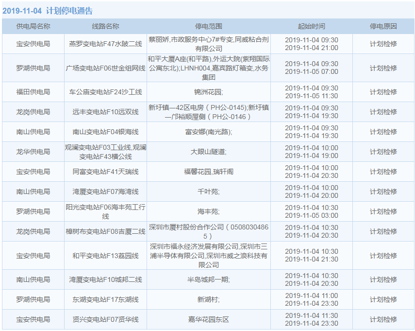 11月1日-15日,深圳這些地方將停電(附全名單)