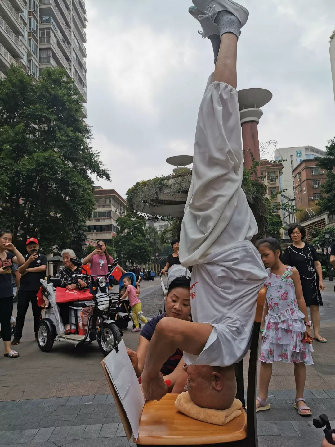 蛇口消息報2019年11月4日訊 頭著板凳倒立、雙手寫字、倒立喝水、倒立吊環(huán),倒立唱歌……做這些高難度動作的人居然是一位85歲高齡的老人。