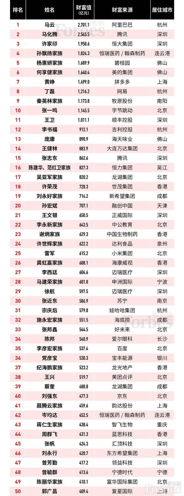 原標題:福布斯發(fā)布2019中國富豪榜:馬云蟬聯(lián)榜首,王健林跌至第14