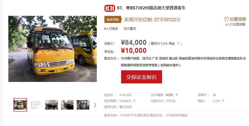 競買人應(yīng)于拍賣會(huì)前在京東拍賣平臺(tái)進(jìn)行實(shí)名登記注冊(cè),注冊(cè)成功后請(qǐng)按京東拍賣平臺(tái)的提示進(jìn)行操作;競買人在對(duì)拍賣標(biāo)的物首次確認(rèn)出價(jià)競拍前,按系統(tǒng)提示報(bào)名繳納10000元/輛的保證金;在競價(jià)過程中,請(qǐng)競買人按規(guī)定的加價(jià)幅度300元出價(jià),若自行出價(jià),請(qǐng)仔細(xì)核對(duì)好出價(jià)金額,若出現(xiàn)出價(jià)金額錯(cuò)誤的情況,由買受人自行承擔(dān)后果;拍賣成交后,買受人請(qǐng)于拍賣成交之時(shí)起72小時(shí)內(nèi)全額支付拍賣成交價(jià)款、拍賣傭金、增值稅及附加、機(jī)動(dòng)車轉(zhuǎn)移登記車牌費(fèi),并到廣東華士德(深圳)拍賣行有限公司所在地(深圳市羅湖區(qū)中興路219號(hào)華興酒店4樓)簽署《拍賣成交確認(rèn)書》及辦理相關(guān)手續(xù)。