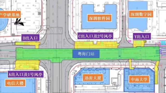 粵海門站位于白石路與科苑南路交叉口處,車站出入口共計4個,其中A出入口位于電信大樓旁,D出入口位于深港產(chǎn)學(xué)研基地旁,C、Y出入口位于白石路北側(cè),靠近深圳軟件園及數(shù)字園。