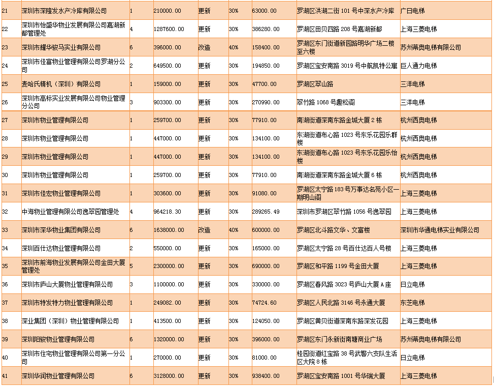 見圳客戶端·深圳新聞網(wǎng)2019年11月15日訊 11月13日,深圳市市場(chǎng)監(jiān)督管理局羅湖監(jiān)管局發(fā)布關(guān)于2019年羅湖區(qū)老舊電梯更新改造大修補(bǔ)助名單的公示,公示稱,為推進(jìn)羅湖區(qū)老舊電梯更新改造大修工作,保障市民群眾生命安全,羅湖區(qū)施行老舊電梯更新改造大修補(bǔ)助政策。2019年,經(jīng)專家現(xiàn)場(chǎng)驗(yàn)收,羅湖區(qū)共有41家申請(qǐng)單位的112臺(tái)老舊電梯更新改造大修工程通過驗(yàn)收(其中更新84臺(tái)、改造12臺(tái),大修16臺(tái)),涉及工程總價(jià)3084.57萬元,發(fā)放補(bǔ)助資金9640009.05元。