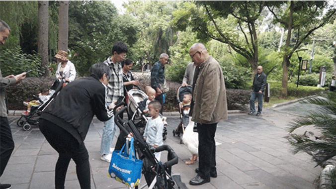 這一人一鵝的“夕陽紅”組合,