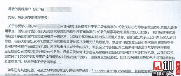 近日,葉先生向深圳新聞網(wǎng)記者爆料稱,他于今年8月份通過攜程網(wǎng)購買國慶期間深圳往返倫敦的機(jī)票,但轉(zhuǎn)機(jī)時(shí)卻因查不到登機(jī)信息導(dǎo)致滯留機(jī)場(chǎng),又因航司規(guī)定被剝奪返程機(jī)票的使用權(quán)。事后,葉先生反復(fù)與平臺(tái)及航司溝通要求說明事件原因并要求賠償,但目前事件尚未完全解決。