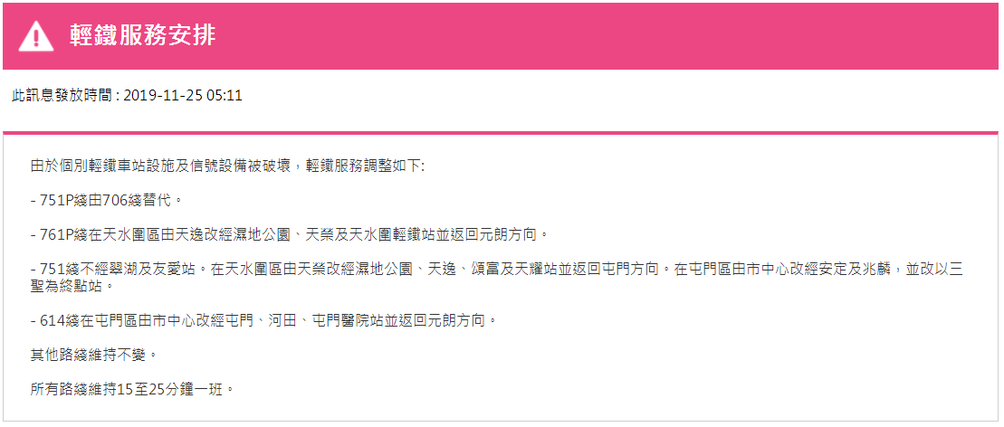 據(jù)港鐵消息,11月25日,香港地鐵各線(機(jī)場(chǎng)快線除外)、輕鐵及港鐵巴士的服務(wù)將于晚上11時(shí)結(jié)束。紅磡站恢復(fù)列車服務(wù),但只開放B、C出入口。大學(xué)站繼續(xù)關(guān)閉,列車不停大學(xué)站,個(gè)別車站出入口也會(huì)暫時(shí)關(guān)閉。