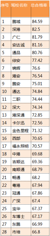見圳客戶端·深圳新聞網(wǎng)2019年12月5日訊 12月4日,深圳市公安局交通警察局官網(wǎng)發(fā)布了2019年11月駕校質(zhì)量排行榜。記者了解到,參與考試質(zhì)量排名的駕培機構(gòu)共有38所,其中,鵬城駕校排名第一,合格率為84.59%。值得注意的是,在上個月(10月)駕校考試質(zhì)量排行榜中,排名第一的也是鵬城駕校。深港駕校11月總合格率為82.5%,排名第二。廣仁駕校合格率為81.79%,排名第三。全部駕校平均合格率為72.07%。