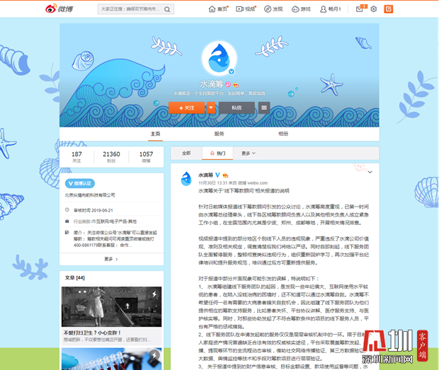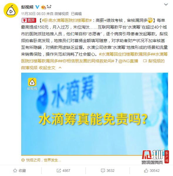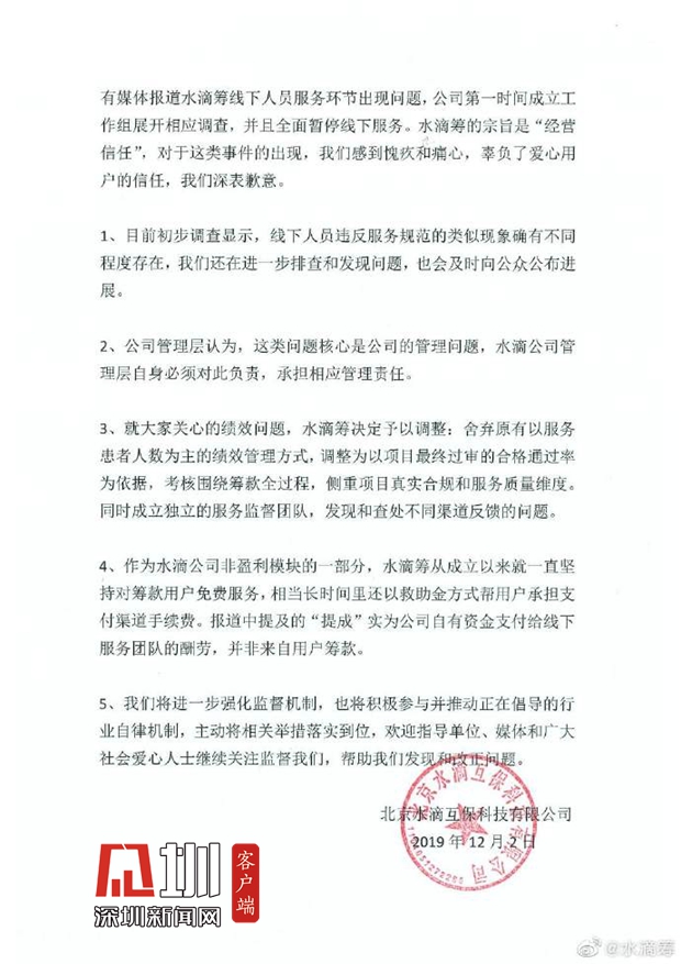 見圳客戶端.深圳新聞網(wǎng)2019年12月6日訊(見圳客戶端、深圳新聞網(wǎng)記者 張玲)2019年11月30日,據(jù)梨視頻報道,互聯(lián)網(wǎng)籌款平臺“水滴籌”在超過40個城市的醫(yī)院派駐地推人員,線下地推服務(wù)人員被指在醫(yī)院“掃樓”尋找求助者,套用模板,隨意填寫金額,不審核甚至隱瞞求助者財產(chǎn)狀況,鼓勵患者大量轉(zhuǎn)發(fā)籌款信息。同日,水滴籌通過微博官方認(rèn)證公眾號回應(yīng)稱,已第一時間成立緊急工作小組開展相關(guān)情況排查,同時線下服務(wù)團(tuán)隊全面暫停服務(wù),整頓徹查類似違規(guī)行為,并對梨視頻報道可能引發(fā)的誤解進(jìn)行了3點(diǎn)說明。