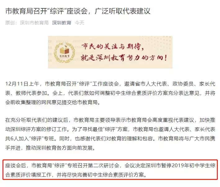 座談會(huì)后,市教育局“綜評(píng)”專班召開(kāi)第二次研討會(huì),會(huì)議決定深圳市暫停2019年初中學(xué)生綜合素質(zhì)評(píng)價(jià)填報(bào)工作,并將盡快完善初中生綜合素質(zhì)評(píng)價(jià)方案。