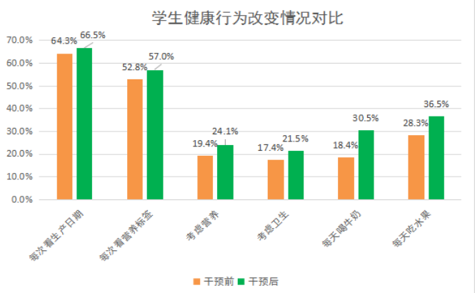 通過(guò)1學(xué)年的營(yíng)養(yǎng)教育活動(dòng),評(píng)估發(fā)現(xiàn),學(xué)生選擇經(jīng)常吃的零食中,水果類(lèi)排名第一,占69.6%;糖果類(lèi)由26.6%明顯下降至19.9%,降幅25%。經(jīng)常喝的飲料依次是白開(kāi)水、純牛奶酸奶、果汁和碳酸飲料,干預(yù)后白開(kāi)水和牛奶比例分別提升至83.4%和76.7%,升幅均超過(guò)10%;果汁和碳酸飲料分別降低至38.9%和17.3%,尤其是碳酸飲料降幅超過(guò)了30%。每天喝牛奶的比例明顯提升至30.5%,升幅65.8%;每天吃水果的比例提升至36.5%,升幅達(dá)到36.5%。每天吃早餐的比例由67.8%上升至74%。