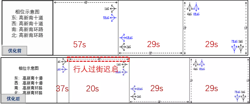 拆分東進(jìn)口機(jī)動車綠燈時間,行人晚啟,以減少東進(jìn)口右轉(zhuǎn)機(jī)動車與北側(cè)行人交織。